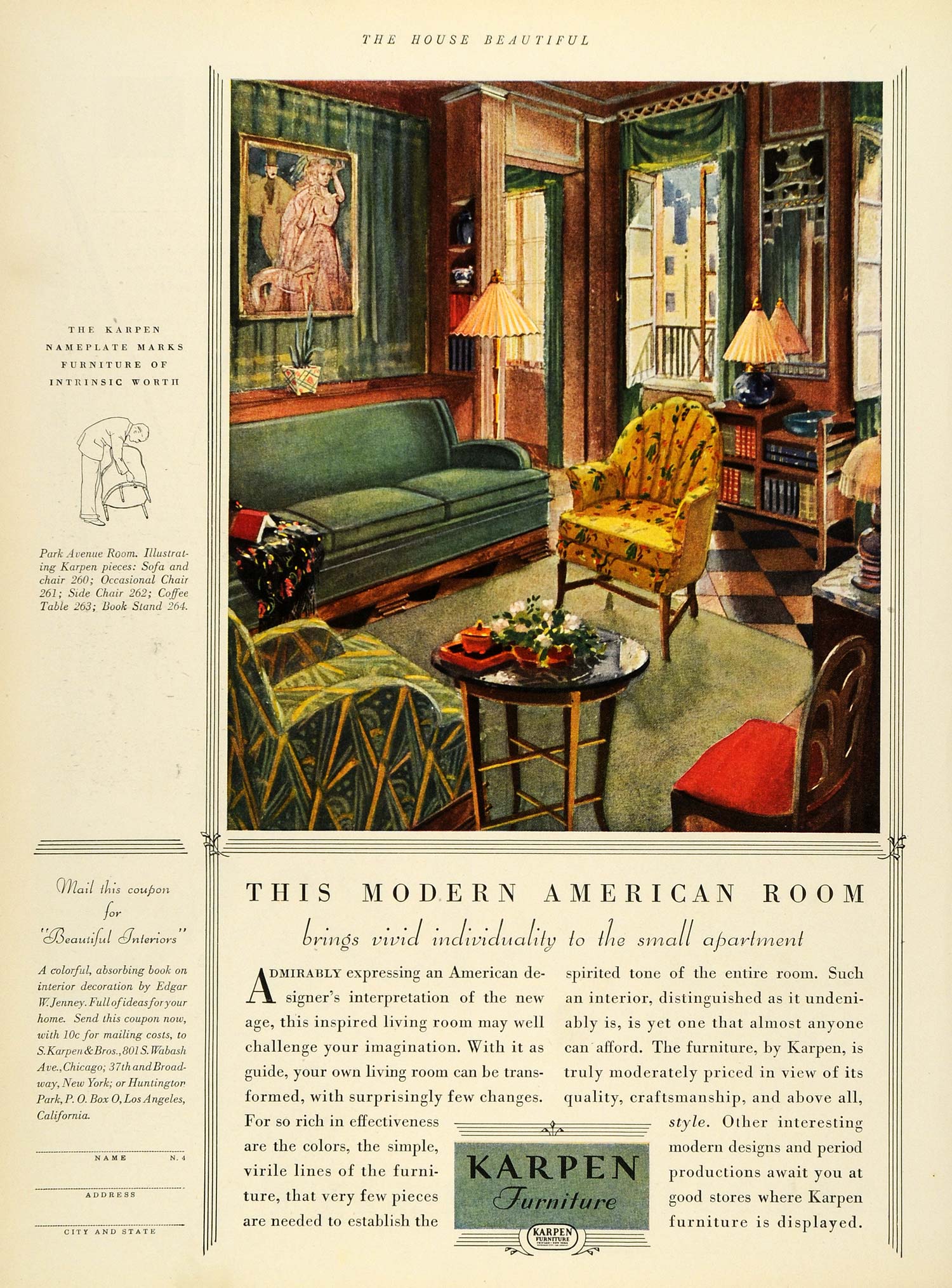 This is an original 1929 color print ad for furniture from S. Karpen & Brothers of 801 S. Wabash Avenue, Chicago, Illinois.