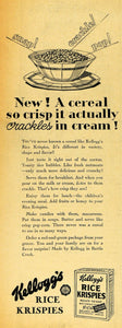This is an original 1929 black and white print ad for Kellogg's Rice Krispies cereal.