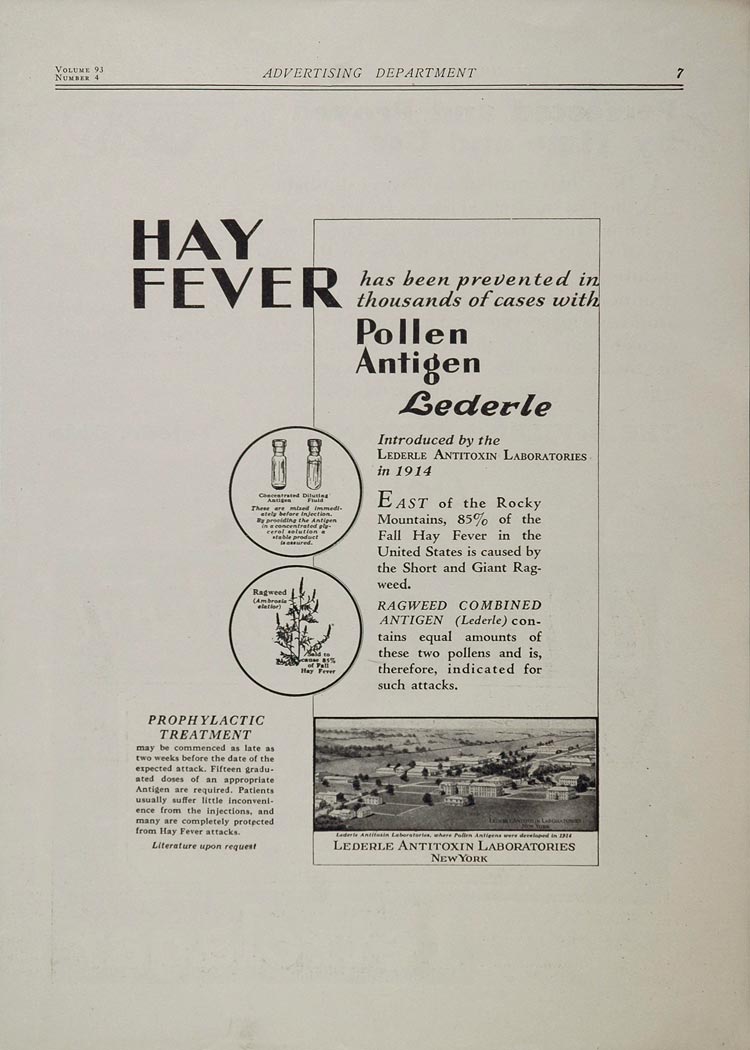 This is an original 1929 ad for Hay Fever Pollen Antigen Lederle introduced by the Lederle Antitoxin Laboratories in 1914. The ad includes a small photo image of the Lederle Antitoxin Laboratories, New York.