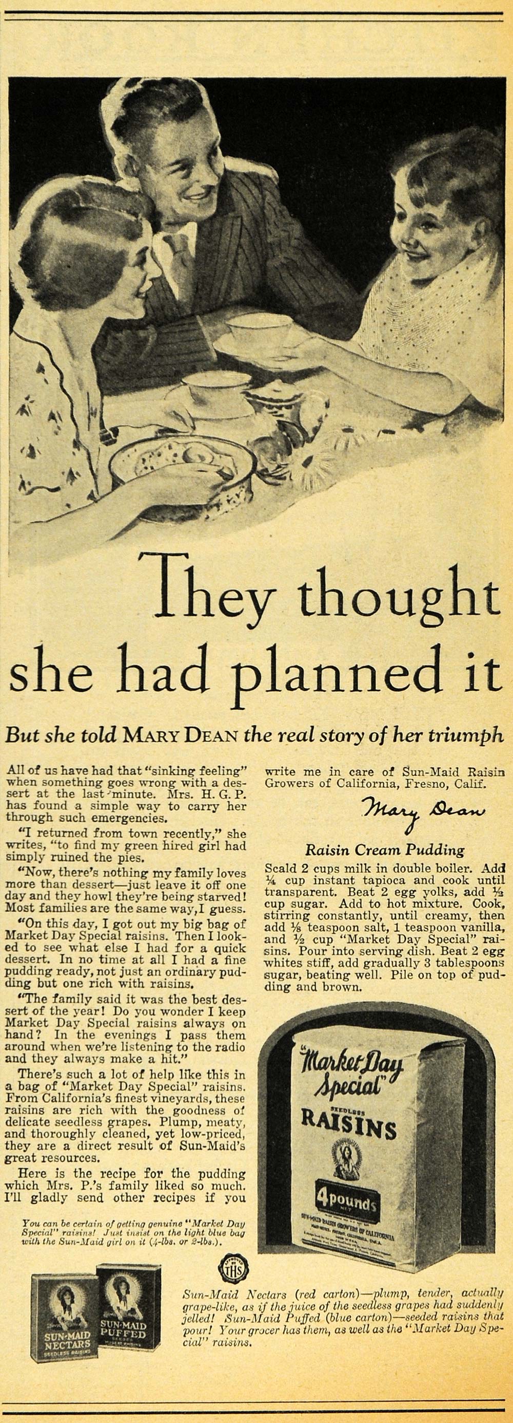 This is an original 1929 black and white print ad for Sun-Maid Raisins and Market Day Special Raisins. This particular ad features a Raisin Cream Pudding recipe by Mary Dean.