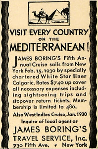 This is an original 1929 black and white print ad for James Boring's Travel Service. The ad is for traveling by the White Star liner, Calgaric.