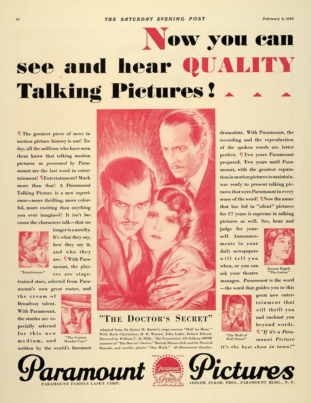 Keywords specific to this image: Adolph Zukor president, Jeanne Eagels, The Letter, The Wolf of Wall Street, The Canary Murder Case, Interference, entertainment, motion picture Vintage Advertising