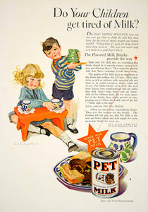 This is an original 1929 color print ad for Pet Unsweetened Evaporated Milk for children.