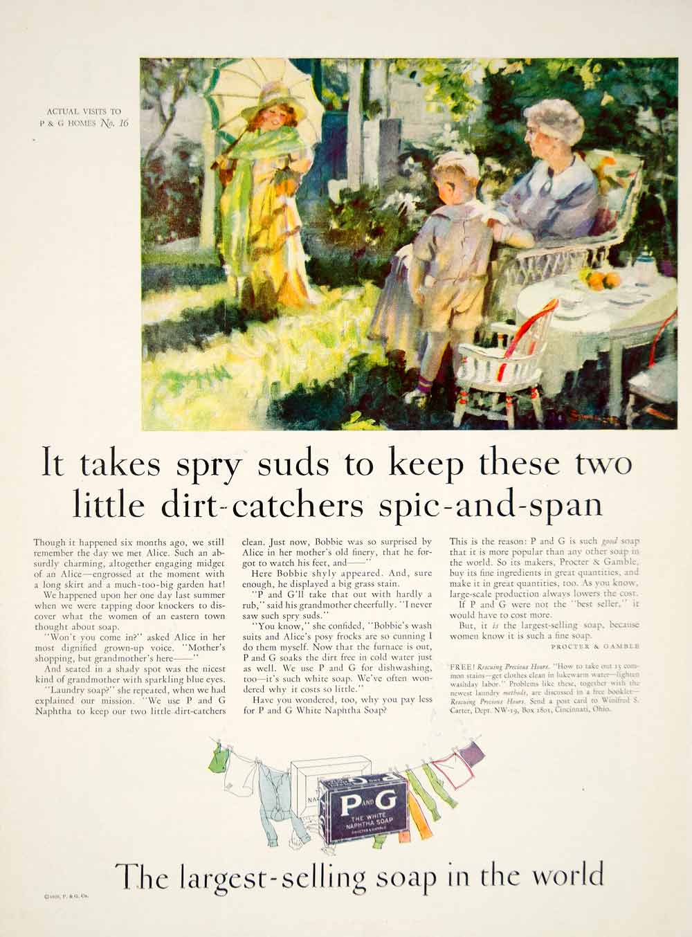 This is an original 1929 color print ad for White Naphtha soap that was made and sold by the Procter & Gamble Corporation of Cincinnati, Ohio (OH).