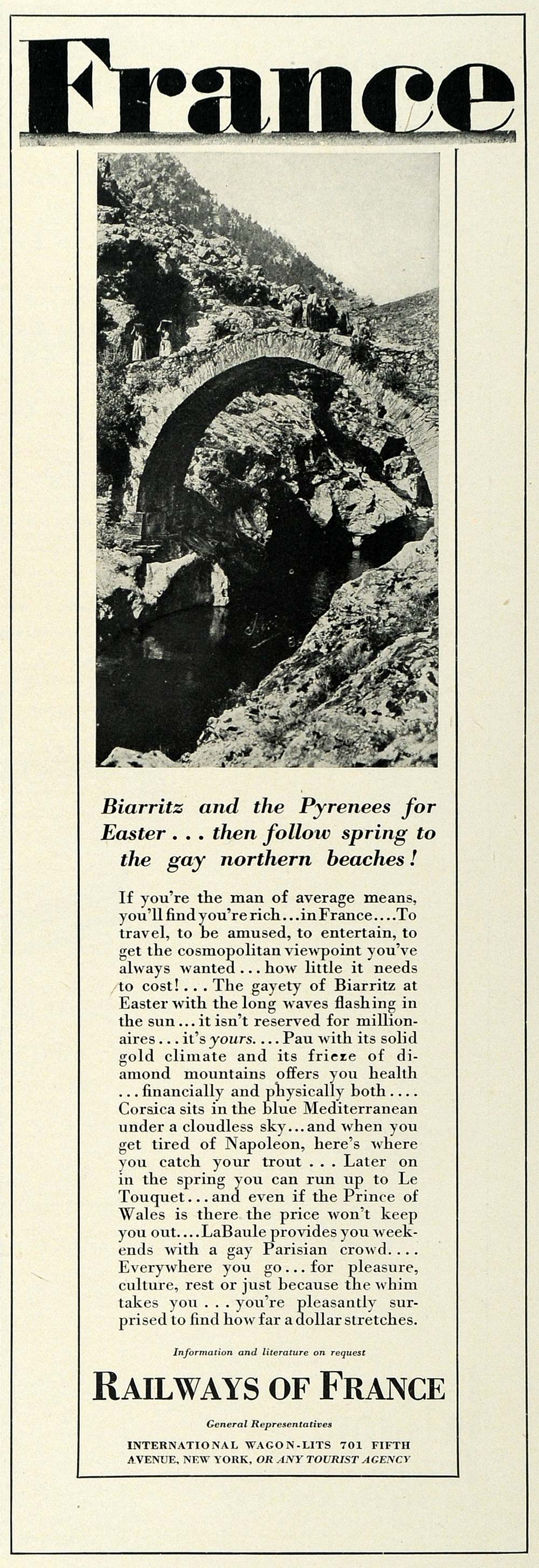This is an original 1929 black and white print ad for the Railways of France.