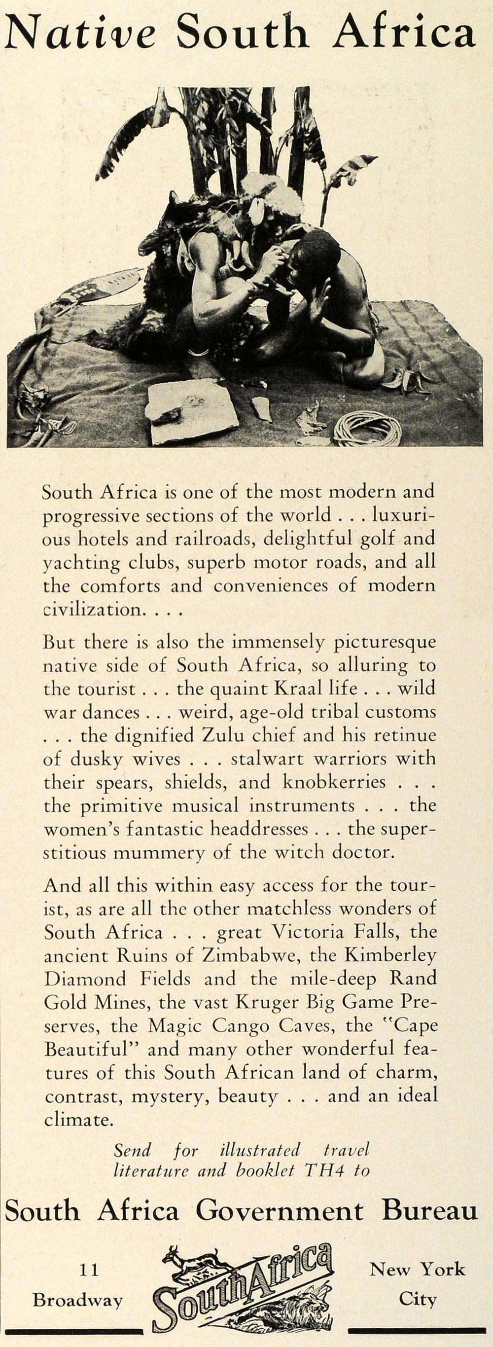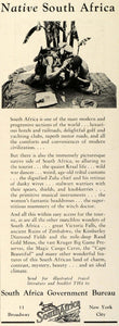 This is an original 1929 black and white print ad encouraging travel and tourism in South Africa, sponsored by the South Africa Government Bureau.