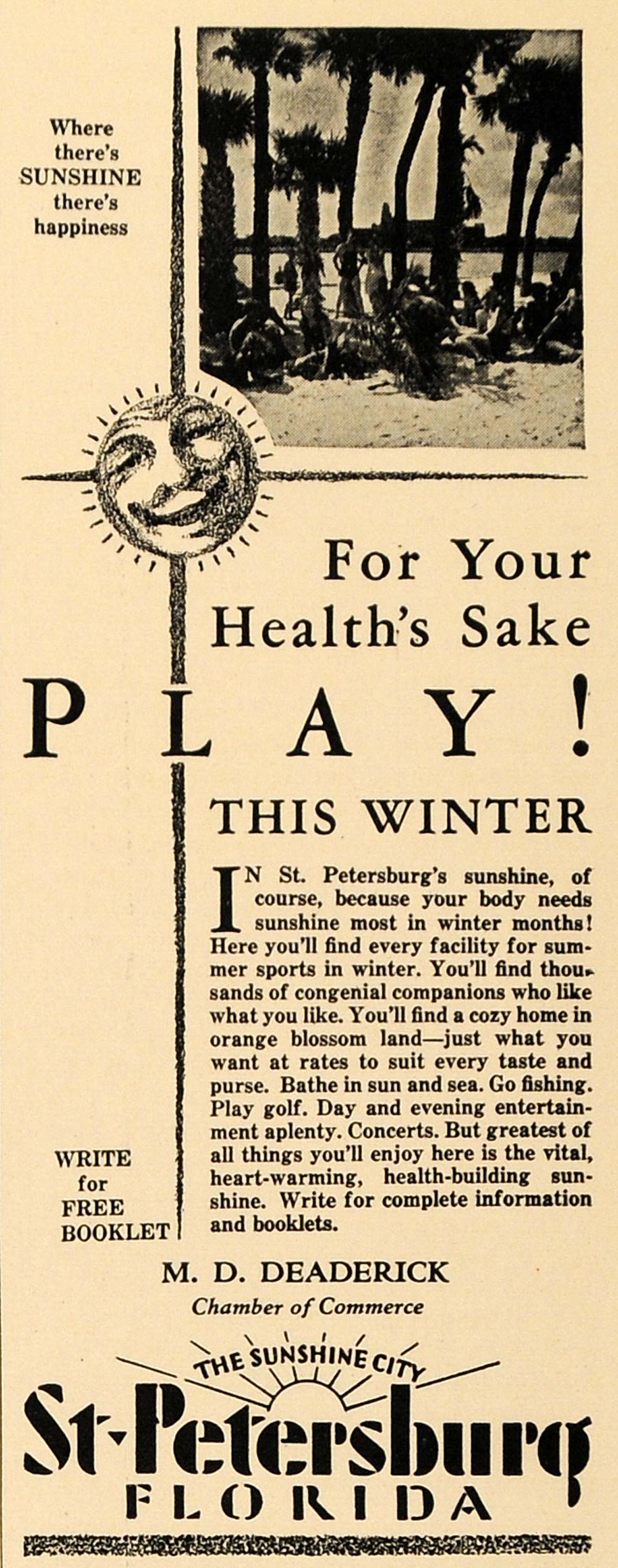 This is an original 1929 black and white print ad for tourism to St. Petersburg, Florida. The ad features an image of the beach.