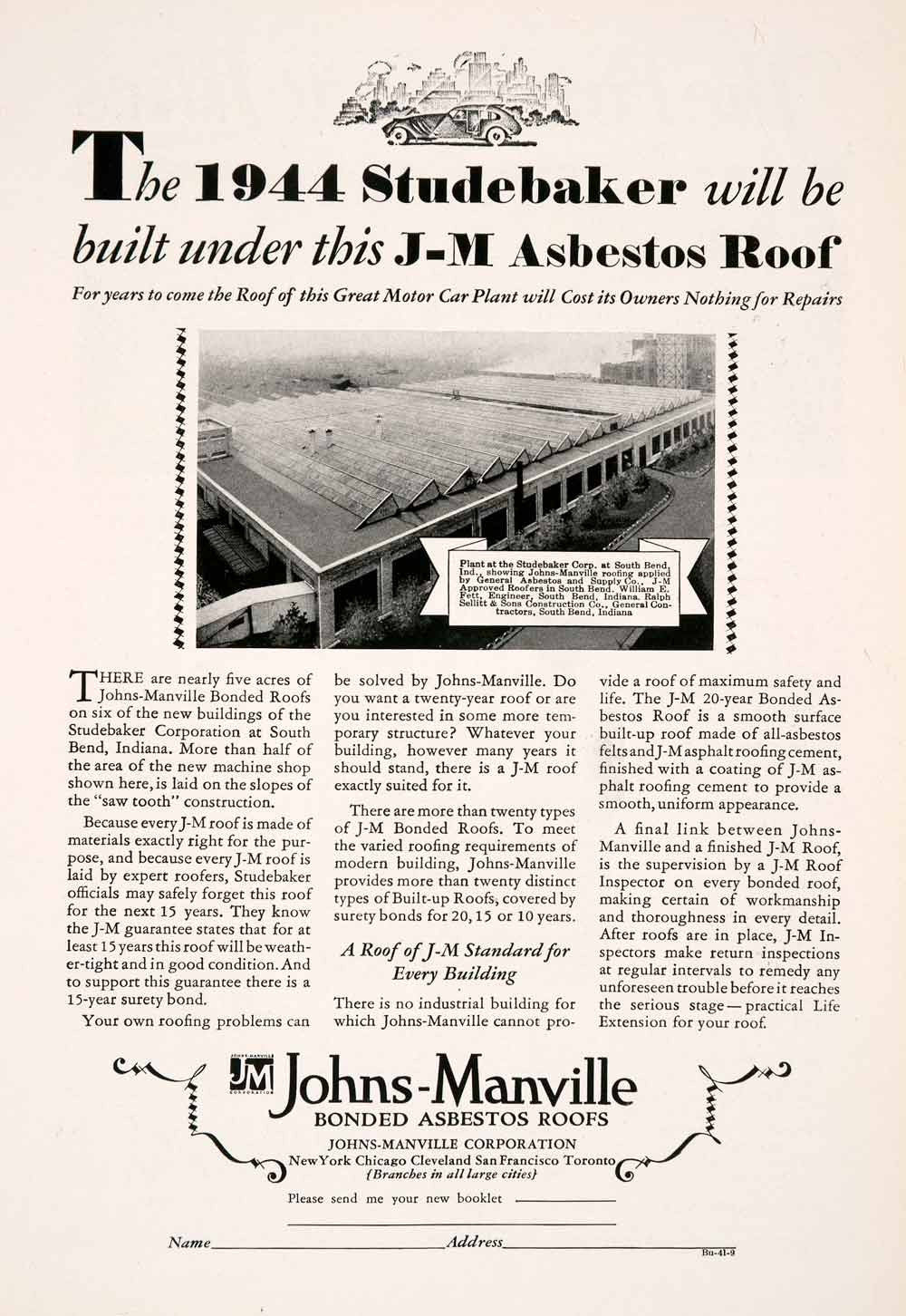 This is an original 1929 black and white print ad for bonded asbestos roofs by the Johns Manville Corporation, which was installed at the Studebaker automobile plant in South Bend, Indiana.