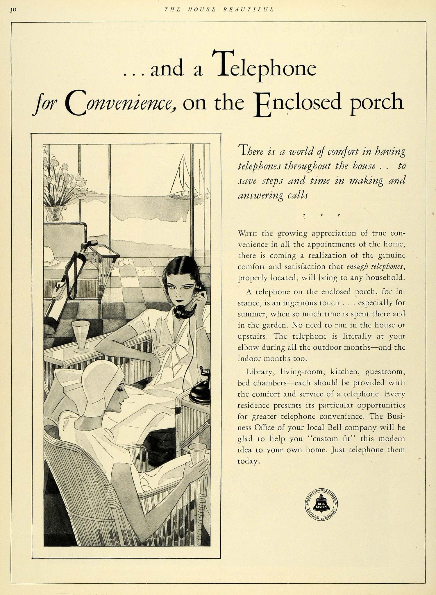 This is an original 1929 black and white print ad for the Bel System from the American Telephone and Telegraph Company. Shown in the image are two women lounging in the patio.