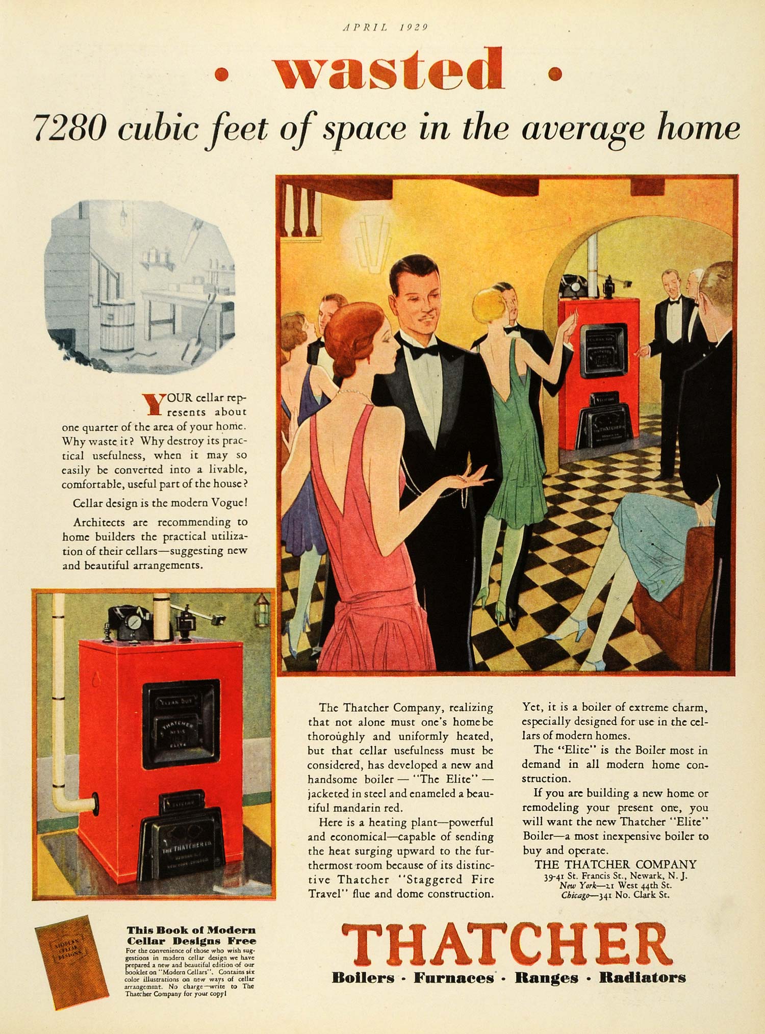 This is an original 1929 color print ad for boilers, furnaces, ranges and radiators from The Thatcher Company of 39 Francis Street, Newark, New Jersey.