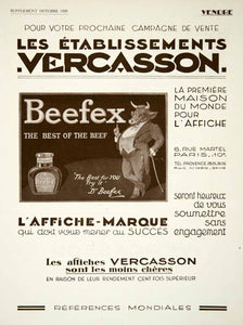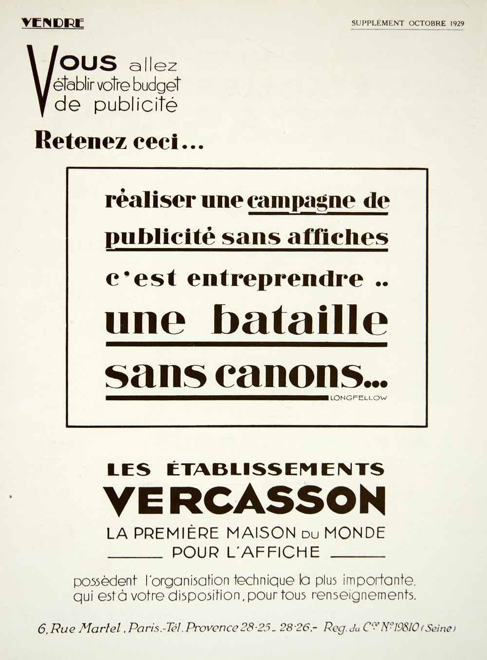 This is an original 1929 two-page monochrome print ad (one double-sided page) for the Vercasson advertising agency, located at 6 rue Martel. Please be sure to view the additional image.