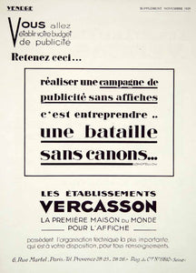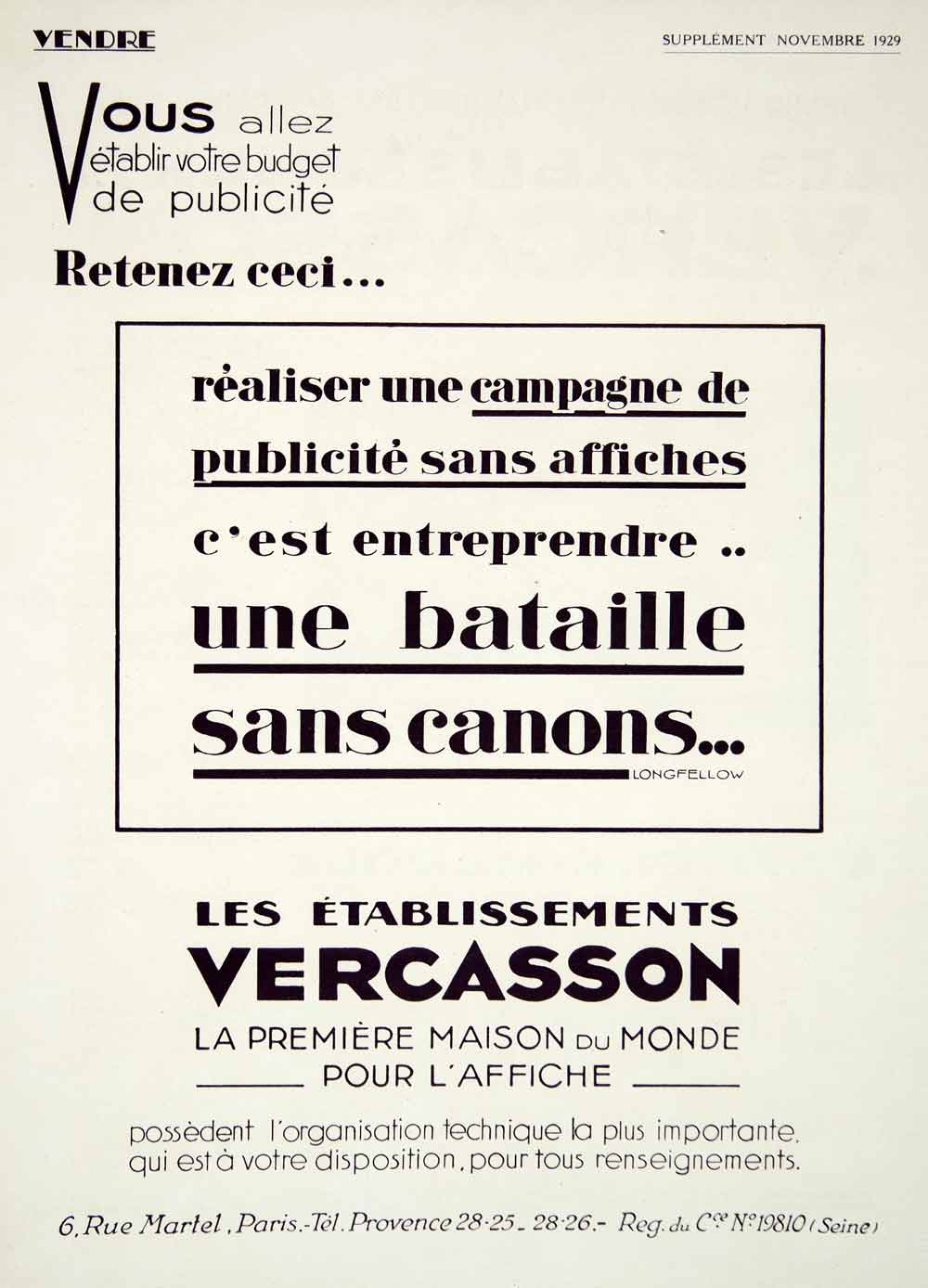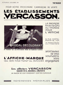 This is an original 1929 two-page monochrome print ad (one double-sided page) for the Vercasson advertising agency, located at 6 rue Martel. Please be sure to view the additional image.