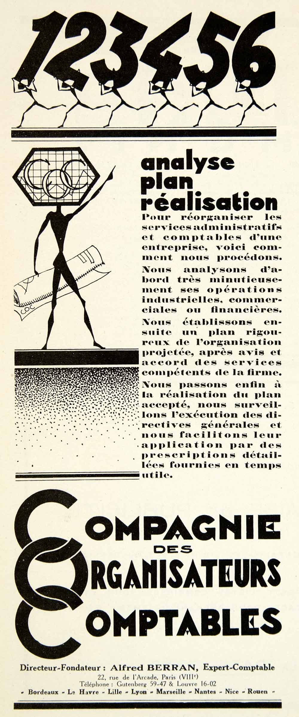 This is an original 1929 black and white print ad for the accounting services of the Compagnie des Organisateurs Comptables located at 22 rue de l'Arcade, Paris.