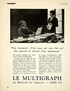 This is an original 1929 black and white print ad for the Multigraph, a convenient office tool that could be acquired at 24 Boulevard des Capucines, Paris.