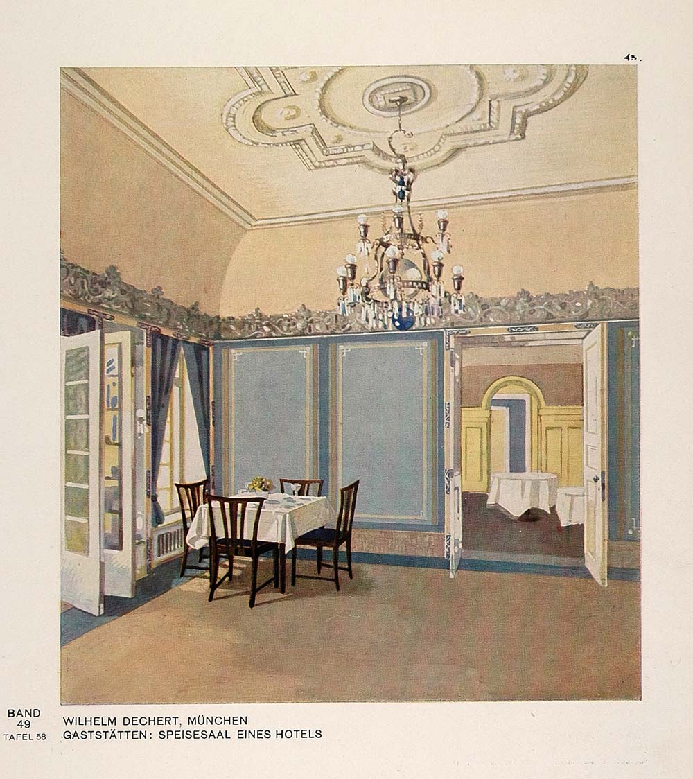 This is an original 1929 color print of an Art Deco interior design for a restaurant dining room in a hotel by Wilhelm Dechert.