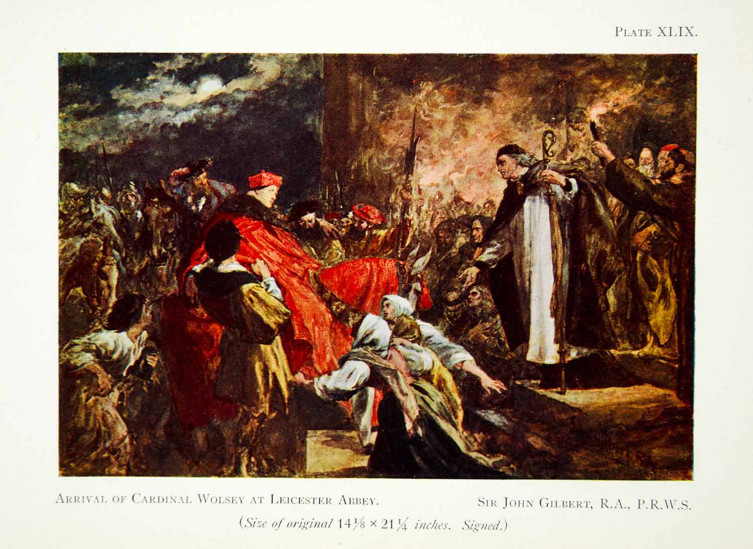 This is an original 1929 color print entitled "Arrival of Cardinal Wolsey at Leicester Abbey" by Sir John Gilbert.