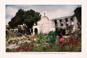 This is an original 1929 color print of the blooming court of the San Juan Capistrano Spanish Mission in California. Photography courtesy of Charles Martin.