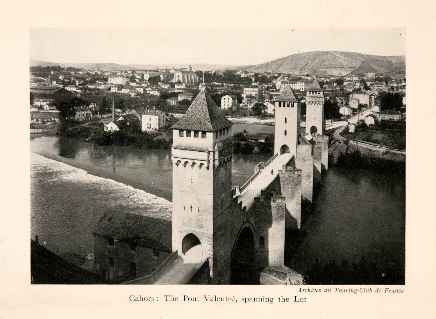 This is an original 1929 black and white halftone print of the Pont Valentré bridge in France. This bridge is a 14th century six-span stone arch bridge crossing the lot river to the west of Cahors. It has become a symbol for the city.