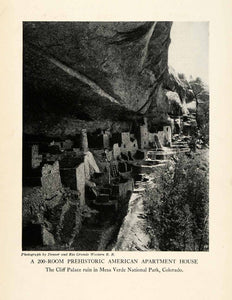This is an original 1929 black and white halftone print of a 200-room apartment house called Cliff Palace of prehistoric America, located in Mesa Verde National Park, Colorado. The ancient Pueblo people built the cliff dwellings, and they remain one of the largest in North America.