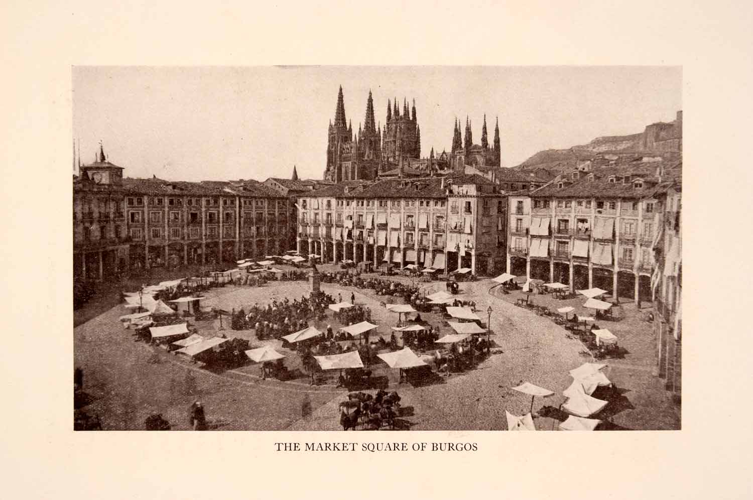 This is an original 1929 sepia halftone print of the market place square of Burgos, Spain.