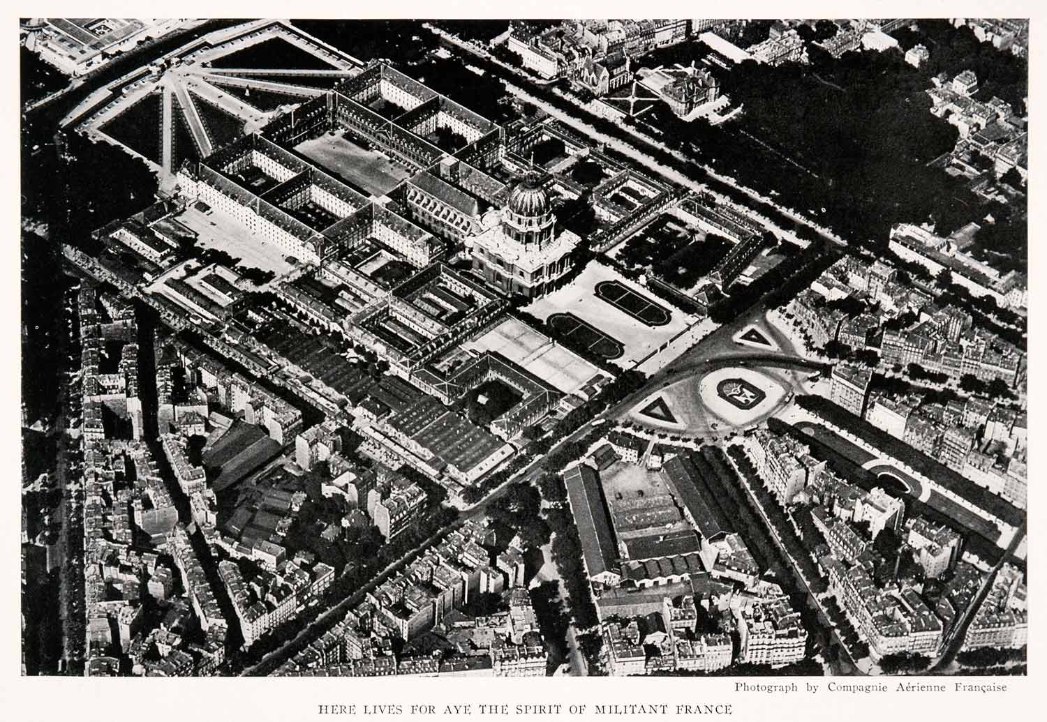 This is an original 1929 black and white halftone print of the Hôtel des Invalides in Paris, France. This structure, founded by Louis XIV around 1670, was used to house disabled veterans. Today (1929), the building serves as a museum of arms and houses only approximately 80 veterans, who act as guides. In 1898, the seat of French military affairs was relocated to this site. Beneath the dome is Napoleon's tomb. To the right of the rectangular court (slightly above and to the left of the main structure) is the railway coach where the Armistice was signed.