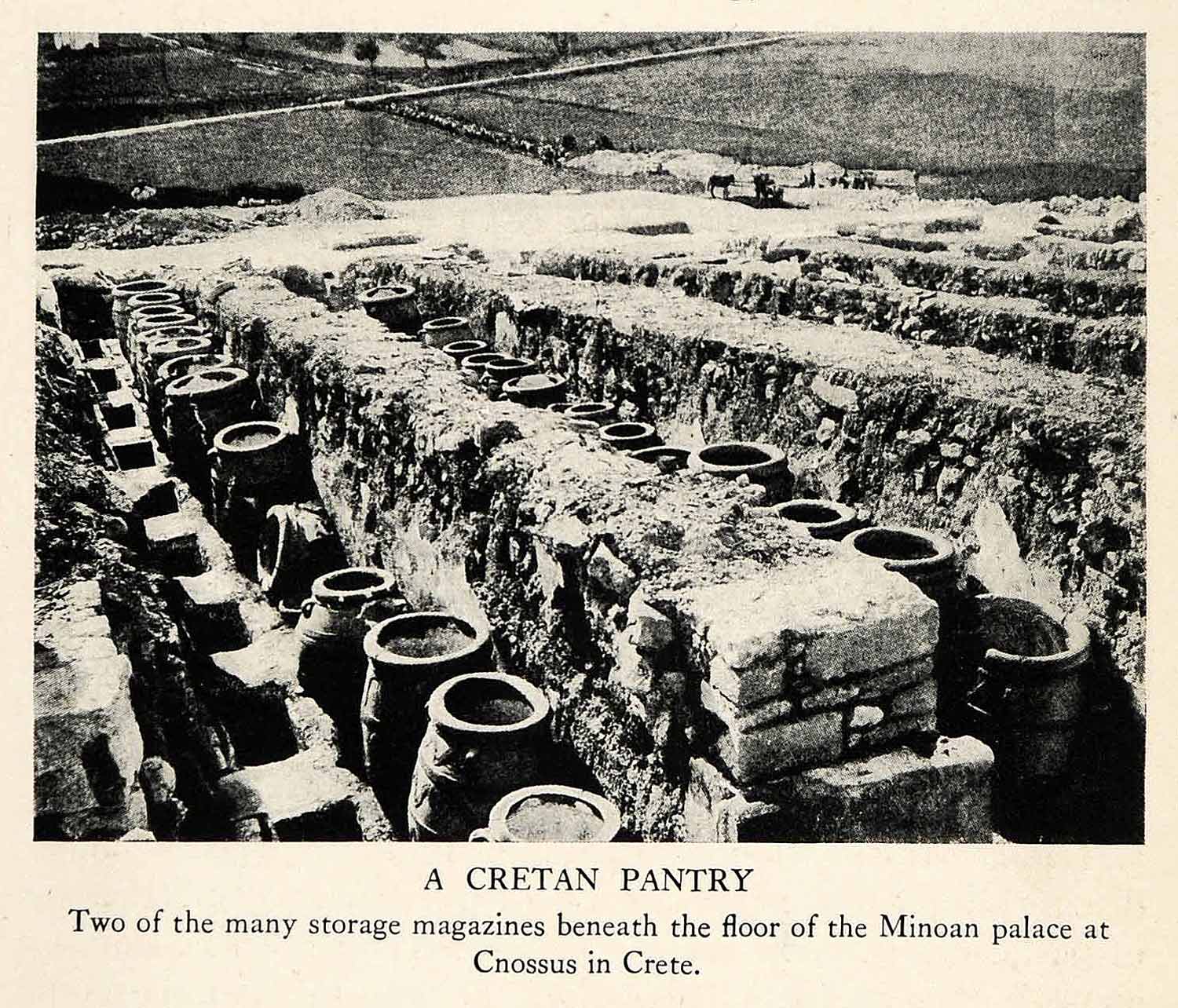 This is an original 1929 black and white halftone print of a storage pantry below the floor of the Minoan Palace at Cnossus, now Knossus in Crete, Greece.
