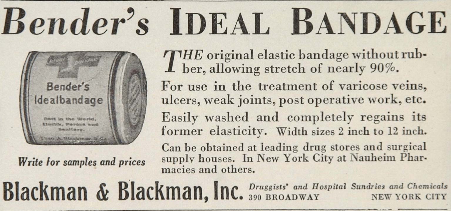 This is an original 1929 ad for Bender's Ideal Elastic Bandage for use in the treatment of varicose veins, ulcers, weak joints, post operative work, etc., from Blackman & Blackman, Inc., 390 Broadway, New York City.