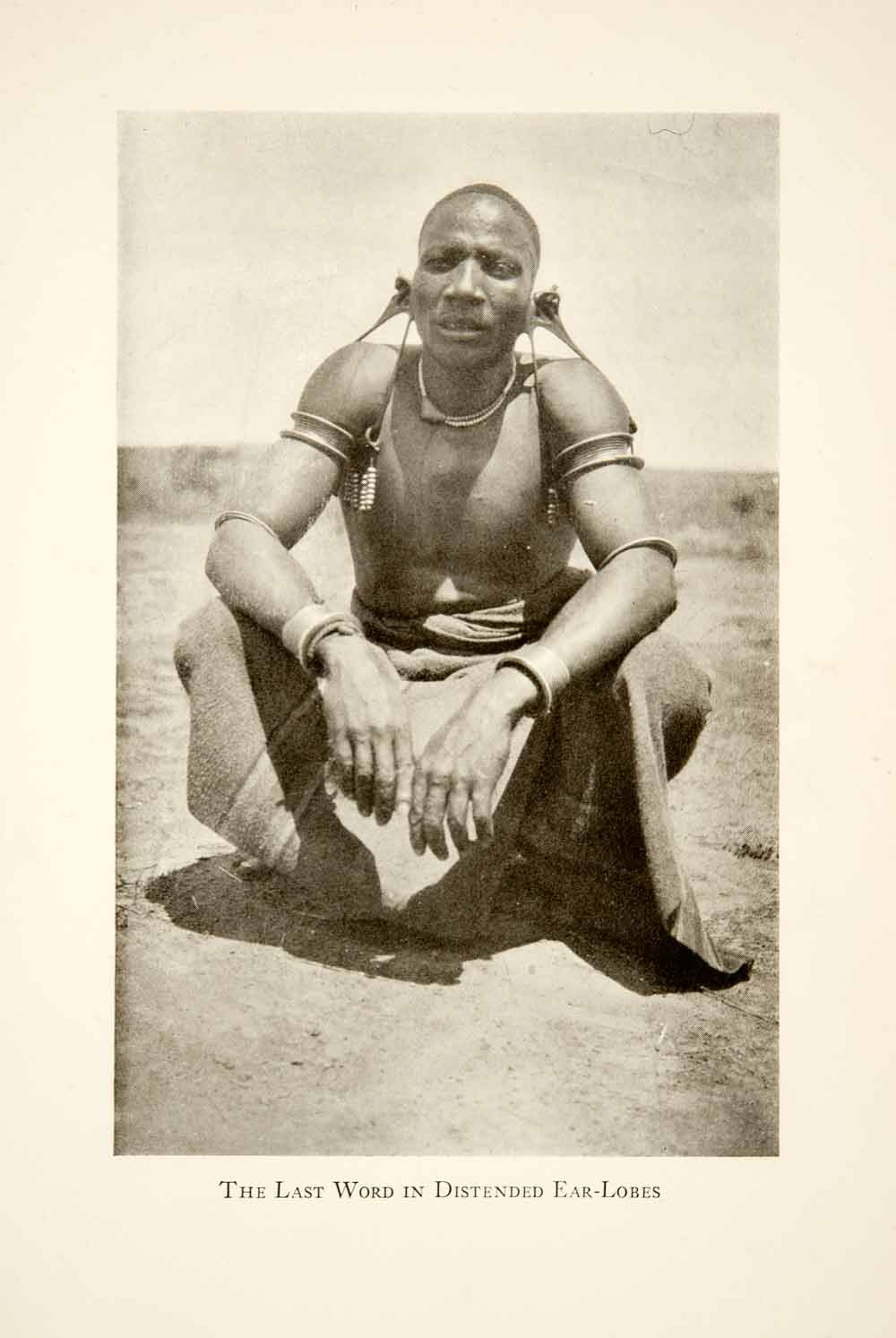 This is an original 1929 black and white halftone print of an African man who has stretched and distended his earlobes so much that he can fit his arms through the holes. His ears literally loop through his armpits. People of some African tribes distend their earlobes with larger and larger objects because it is seen as physically appealing. It is also viewed as a competition to see who can have a bigger hole in their ear before the flesh rips.