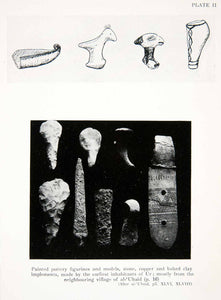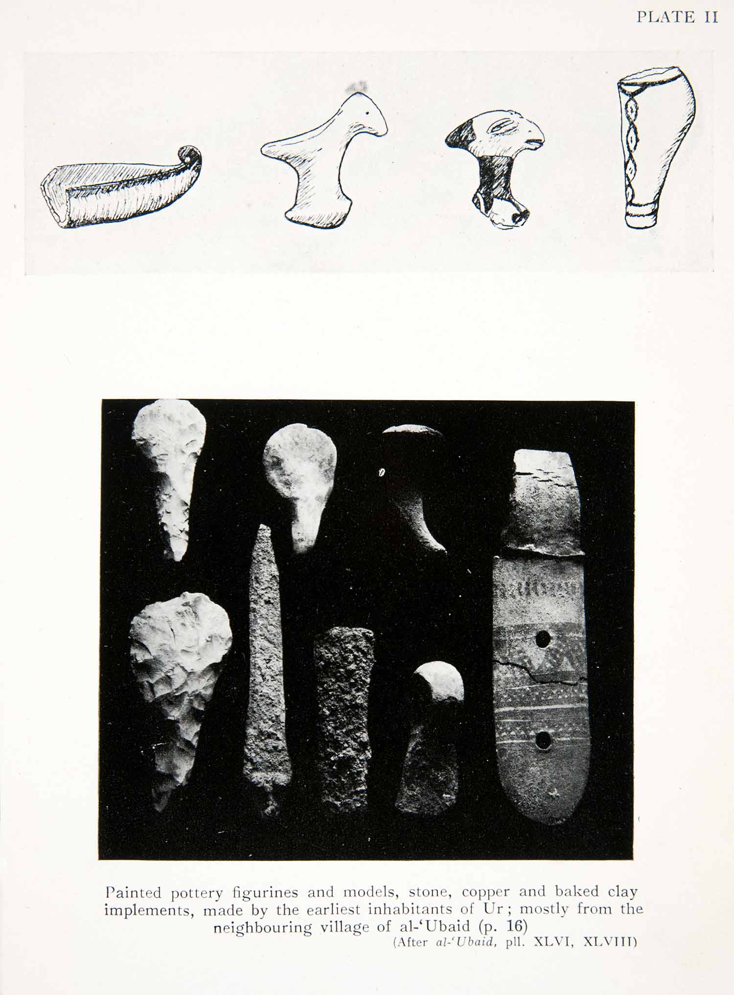 This is an original 1929 black and white halftone print of painted pottery figurines and models, stone, copper and baked clay tools that were made by the earliest inhabitants of Ur.