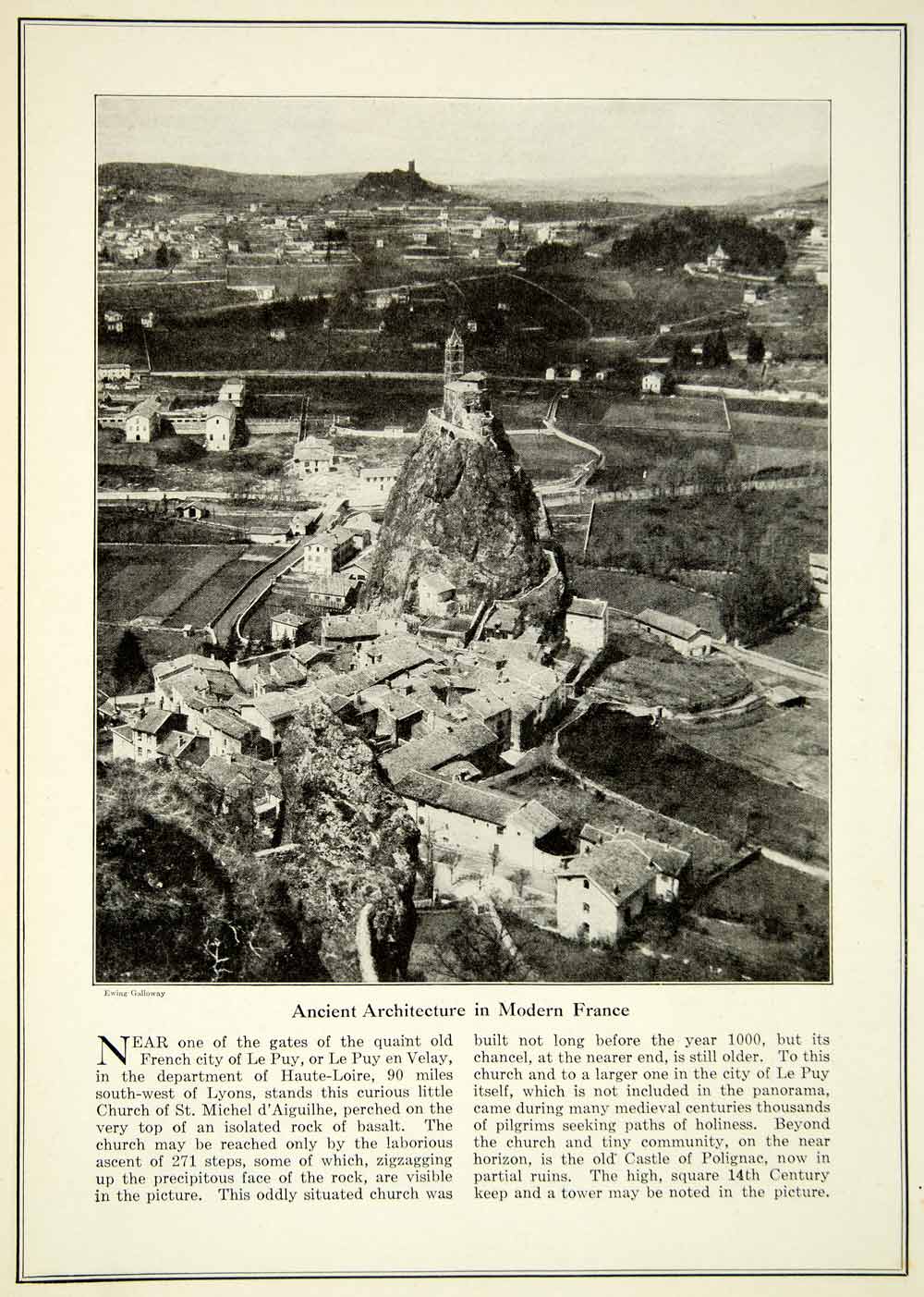 This is an original 1929 black and white halftone print of the Church of St. Michel d'Aiguilhe, located on top of a basalt rock in the French city of Le Puy, or Le Puy en Velay. The Chapel of Saint Michel d'Aiguilhe can be seen precariously perched atop a volcanic rock formation. Two hundred and sixty-eight steps carved into the rock allow pilgrims to reach the chapels entrance. It would suck to be the mailman for that place.