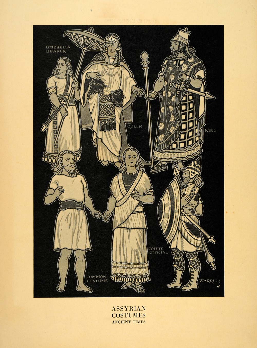 This is an original 1929 halftone print of ancient Assyrian costumes including that of a warrior, King and Queen, umbrella bearer, court official, and a common man.