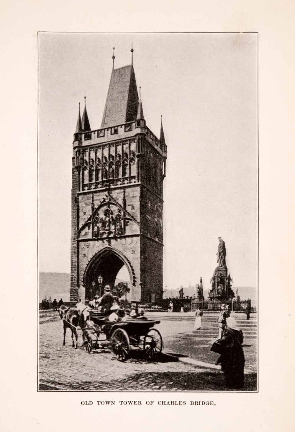 This is an original 1929 halftone print of the Old Town Tower of Charles Bridge in Prague, Czech Republic.