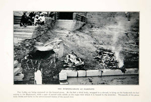 This is an original 1929 black and white halftone print of the Burning-Ghats at Pashpatti in Nepal. The two bodies to the right are being cremated while the third to the left is waiting. Thousands of people drink and bathe in these waters of the sacred Bagmati river.