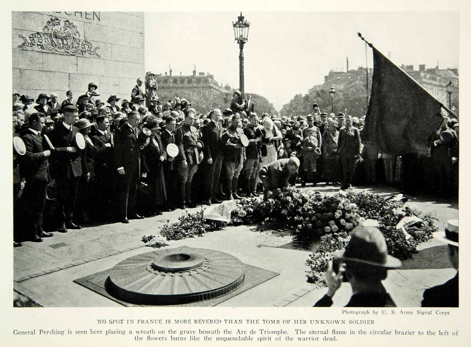 This is an original 1929 black and white halftone print of American General Pershing placing a wreath on the Grave of the Unknown Soldier in Paris, France.