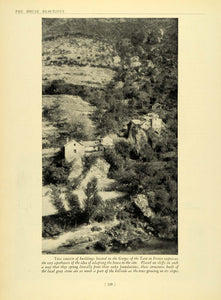 This is an original 1929 halftone print of a bird's eye view of a group of buildings in the Gorges of the Tarn in France, which blend in seamlessly with the rocky terrain of the area.