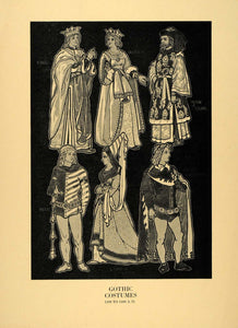 This is an original 1929 halftone print of Gothic costumes, from 1100 to 1400 A.D., including that of a King and Queen, man of rank, man, lady of rank, and a court costume.