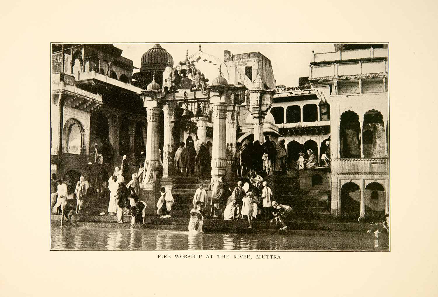 This is an original 1929 black and white halftone print of fire worship near the river in Mathura or Muttra in India.
