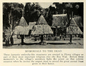 This is an original 1929 halftone print of memorials to the dead. The umbrella-like structure are erected in Flores villages as part of their most important religious rite, the Boa Wae.