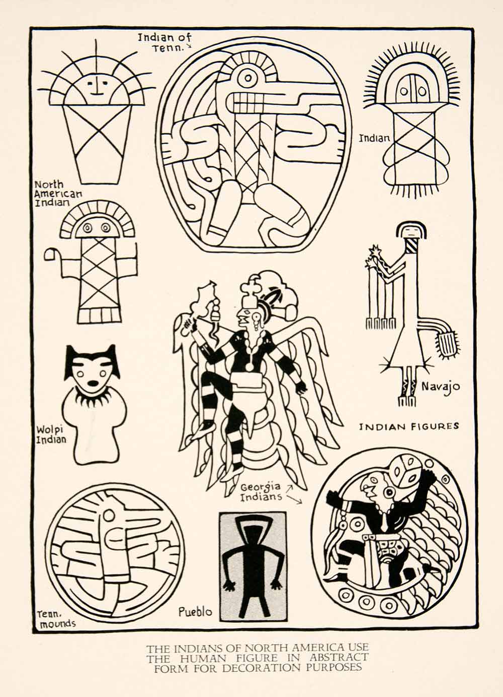 This is an original 1929 black and white relief line-block print of a variety of abstract decorative figures used in Native American culture in North America.