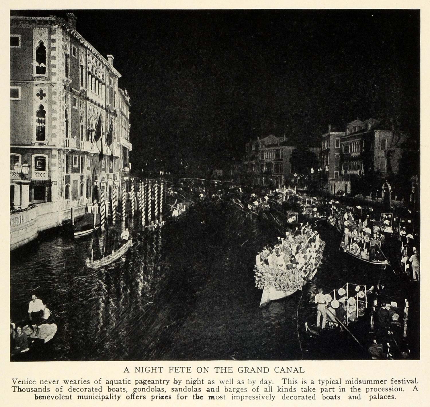 This is an original 1929 halftone print of a night fete on the Grand Canal. This photograph shows a midsummer festival with decorated gondolas, boats, sandolas and barges.