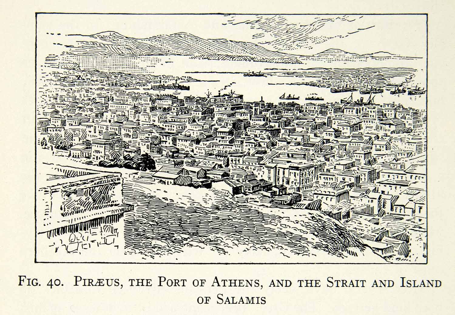 This is an original 1929 black and white relief line-block print of a view of Piraeus, the Port of Athens, and the Strait and Island of Salamis in Greece.