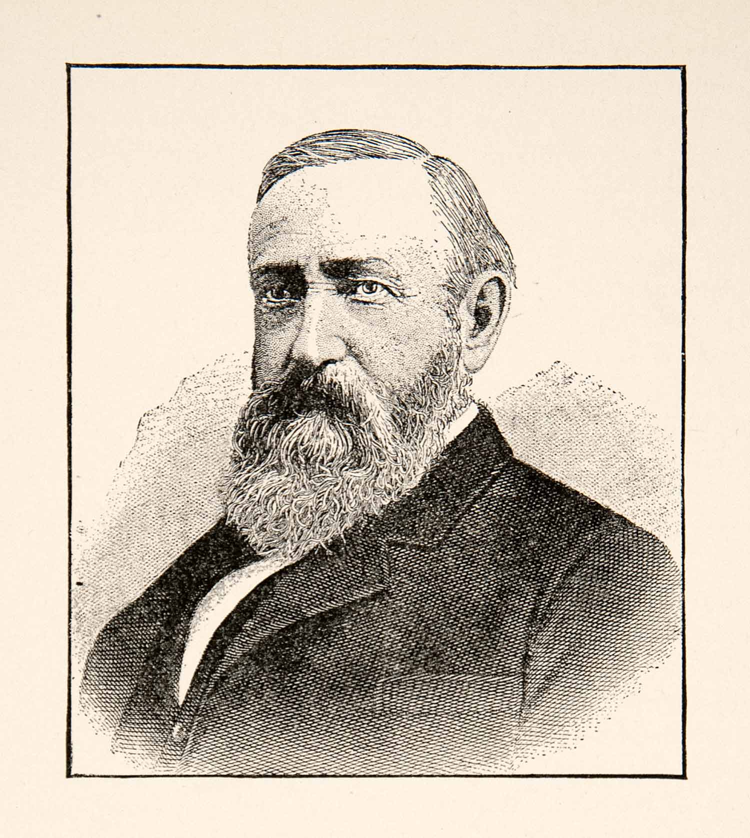This is an original 1929 black and white relief line-block print of a portrait of Benjamin Harrison, the twenty-third President of the United States of America.