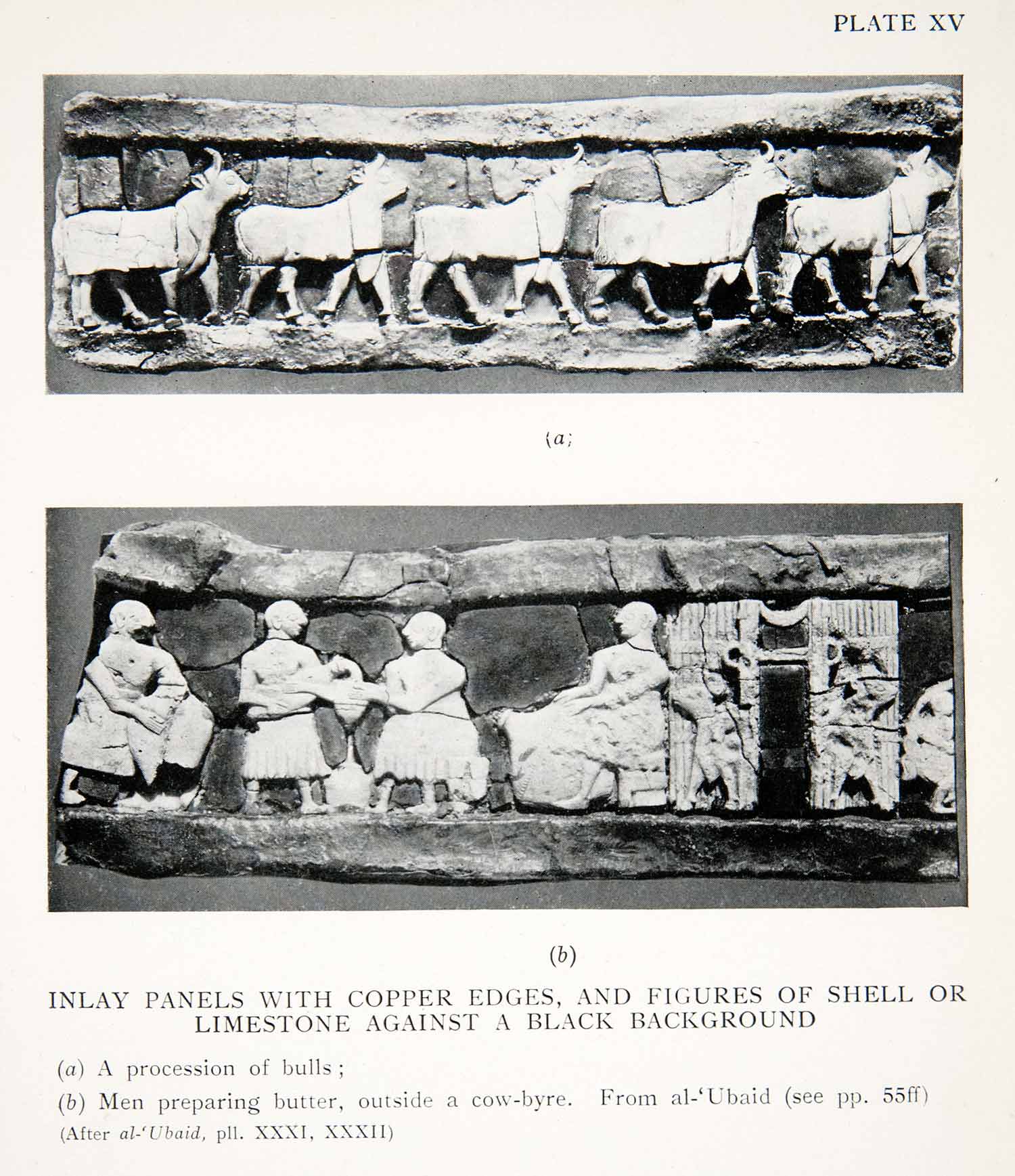 This is an original 1929 black and white halftone print of a procession of bulls in the top image and men preparing butter in a-'Ubaid in the bottom image. Both panels are inlaid with copper edges and the figures are of limestone on a black background.