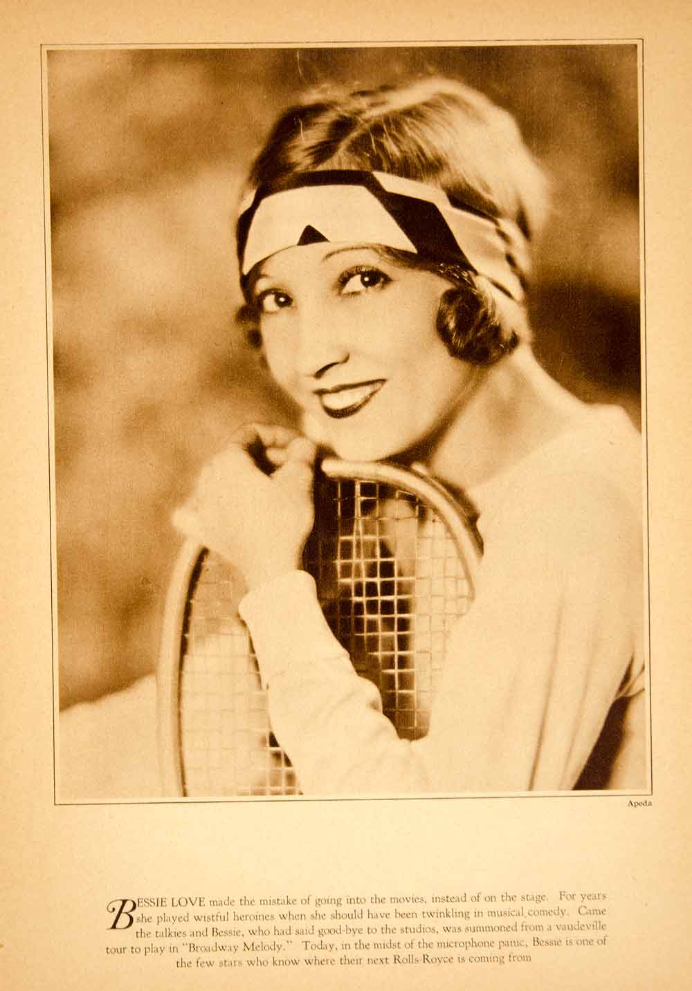 This is an original 1929 sepia rotogravure of movie star, Bessie Love (1898Ð1986). Born Juanita Horton, she was an American silent film actress who appeared in "The Flying Torpedo," "Forget Me Not," "The Eternal Three," and many other films.