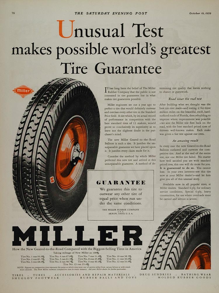 This is an original 1929 two-color print ad for Miller "Geared-to-the-Road" Balloon Automobile Tires from The Miller Rubber Company, Akron, Ohio.