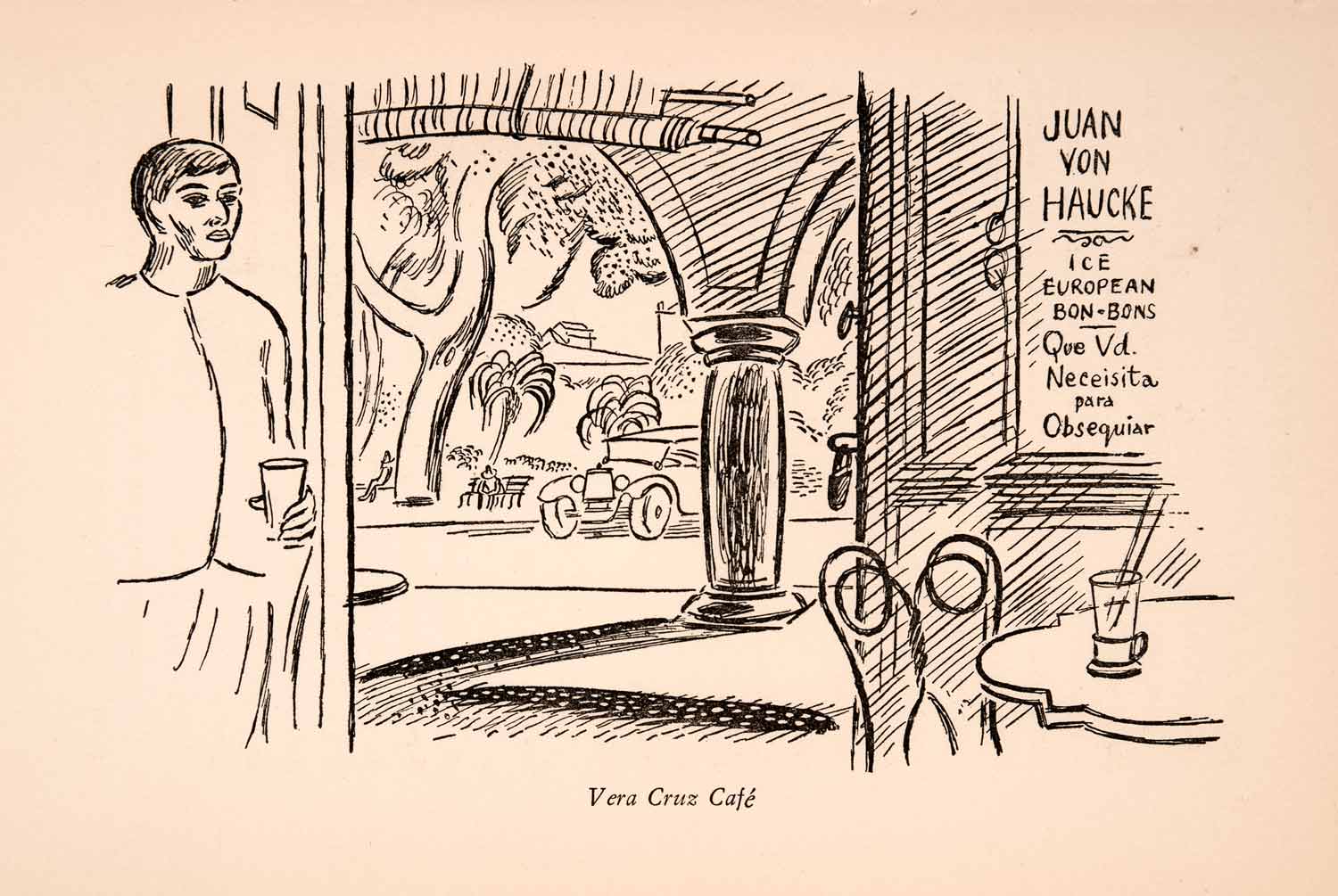 1929 Wood Engraving Vera Cruz Cafe Mexico Waiter Car Colonial Architecture XGLA9