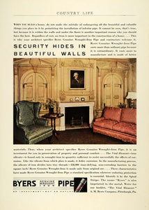 This is an original 1930 color print ad for Byers Genuine Wrought Iron Pipe, a product by the A. M. Byers Company of Pittsburgh, Pennsylvania.