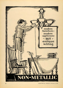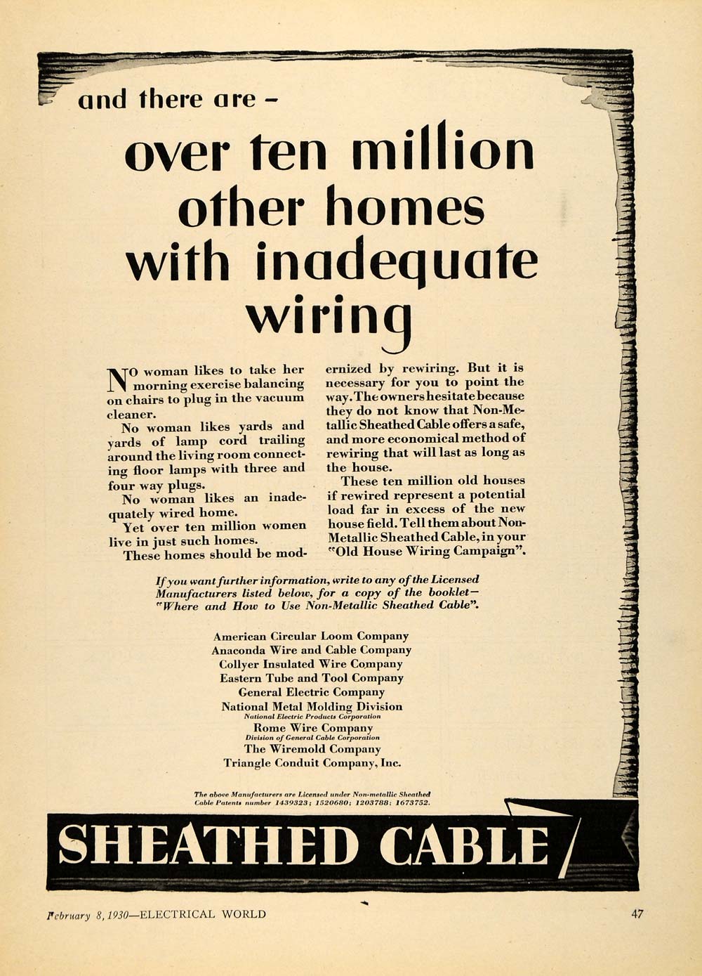 This is an original 1930 black and white two-page print ad for the Non-Metallic Sheathed Cable from Anaconda Wire and Cable Company.