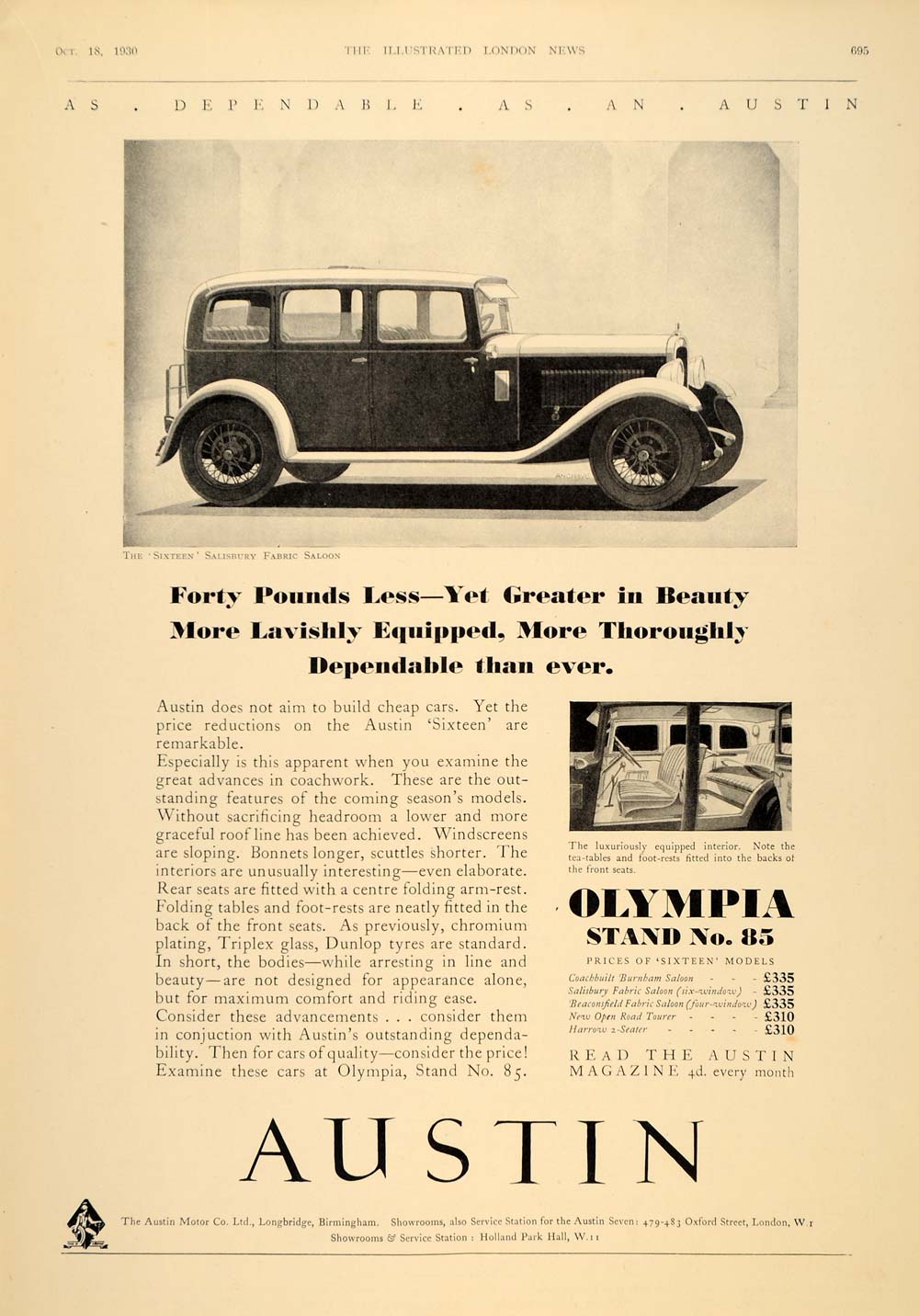 This is an original 1930 black and white print ad for the Austin Sixteen Salisbury Saloon automobile from The Austin Motor Co., Ltd., now a part of the British Motor Corporation Ltd.