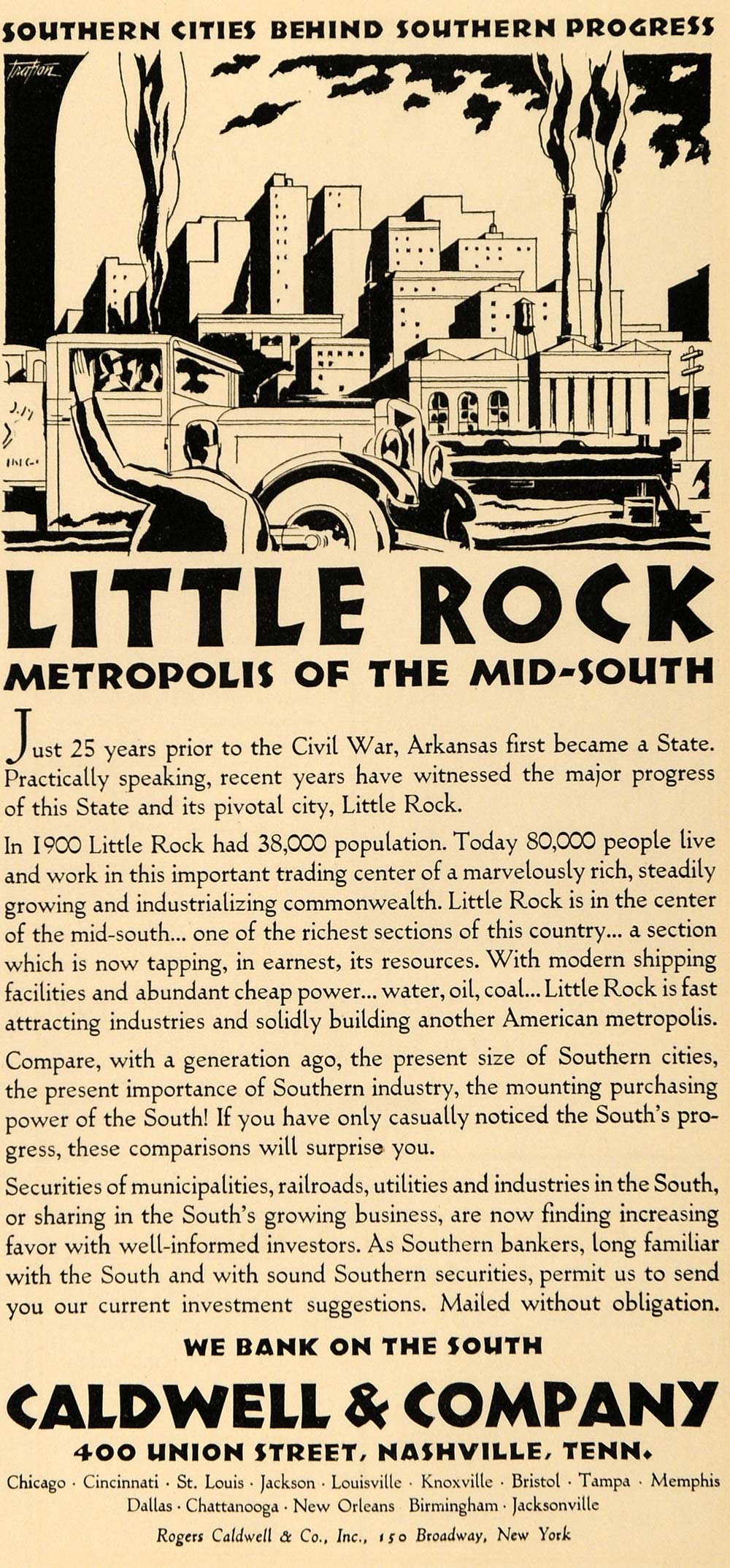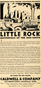 This is an original 1930 black and white print ad for Caldwell & Company, located at 400 Union Street in Nashville, Tennessee. This ad features the Little Rock metropolis of the Mid-South. This ad features artwork by an unknown artist.